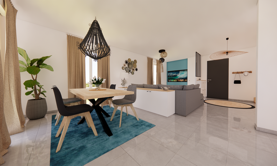 que vous pourrez aisément mettre sur le côté si vous souhaitez profiter de l'espace. Au dessous, pour apporter confort et chaleur, un tapis d'un joli bleu turquoise pour rappeler les murs TV et cuisine. Idéalement, vous pouvez assortir avec le même tapis du même format sous la table de séjour.
