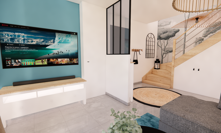 Dans la partie entrée, à droite en entrant, j'imagine rallonger le mur du coffrage pour séparer visuellement l'entrée du salon et y insérer une petite verrière 3 vitrages noire. Au dessous, un meuble à chaussures blanc recouvert d'une tablette en hêtre de faible profondeur pour optimiser l'espace. Derrière ce mur, et afin de fermer l'accès à vos compteurs, une porte de placard blanche sera prévue, assortie à votre mobilier.