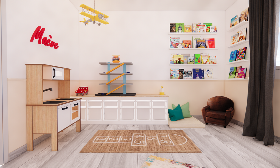 Plusieurs espaces se distinguent dans la pièce, un peu comme si Maève et Théo avaient leur propre petite maison à eux. Ainsi, il retrouverons le coin cuisine, puis le coin salon/lecture, le coin rangements avec un plan de travail pour jouer à hauteur et accessoirement ranger le garage de Théo pour faciliter le ménage, le coin établi pour bricoler à la lumière, le coin séjour avec une table et deux petites chaises qui leur permettrons de manger les bons plats dinette préparés dans la cuisine ou encore dessiner de supers œuvres d'art.
